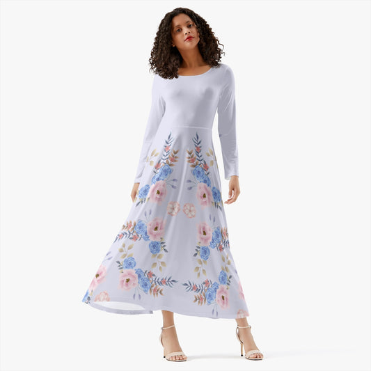 Cottagecore Women's Long-Sleeve Casual Dress, Blue Flowers